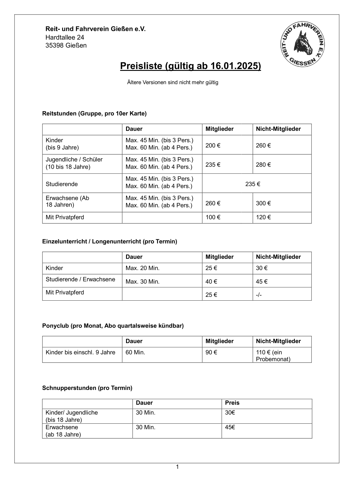 Enthält die Preise für Vereinsmitgliedschaft, Unterricht, Voltigieren, Einstellen und Anlagennutzung.